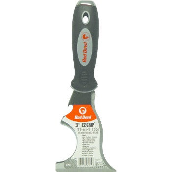The Ergo EZ Grip 11-In-1 Tool is a versatile painter's and decorator's tool that can be used for a variety of professional and household applications. It is specially designed with ergonomically engineered handles to decrease hand fatigue. Extra sturdy, high carbon steel blades resist rust and extend through handles for maximum strength and durability. Durable brass-plated, solid steel, nail setting head can be used for setting nails and other hammering jobs. Uses include: scraper, spreader, gouger, hammer, rake, opener, linoleum knife, putty remover, paint roller cleaner, nail setter and nail puller.